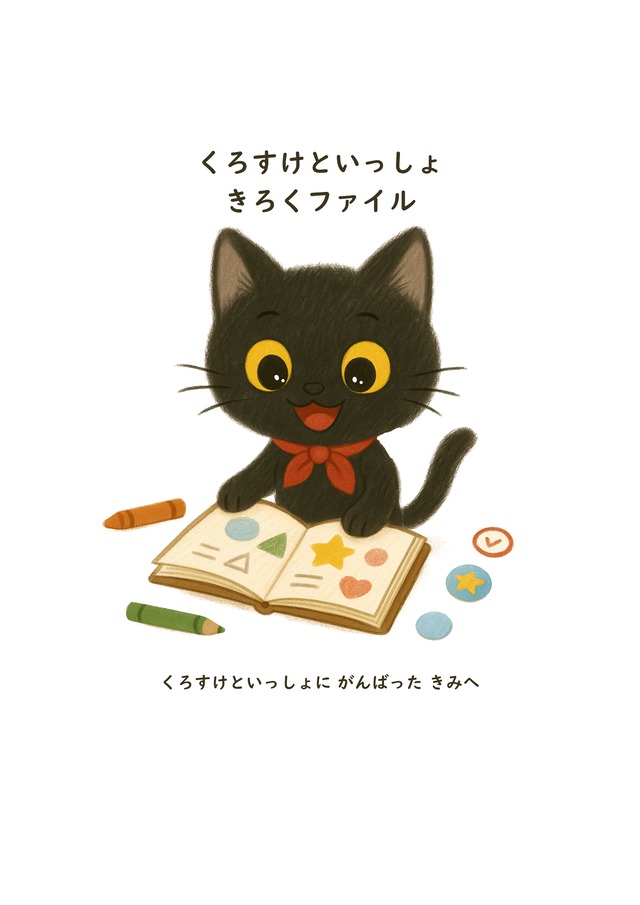 「できたね!」が思い出になる。 くろすけと一緒に、お子さまのがんばりを1冊にまとめるファイリング用キットです。 完成したワークや記録シートをとじて、 成長の証と心あたたまる記念に。