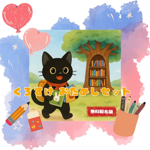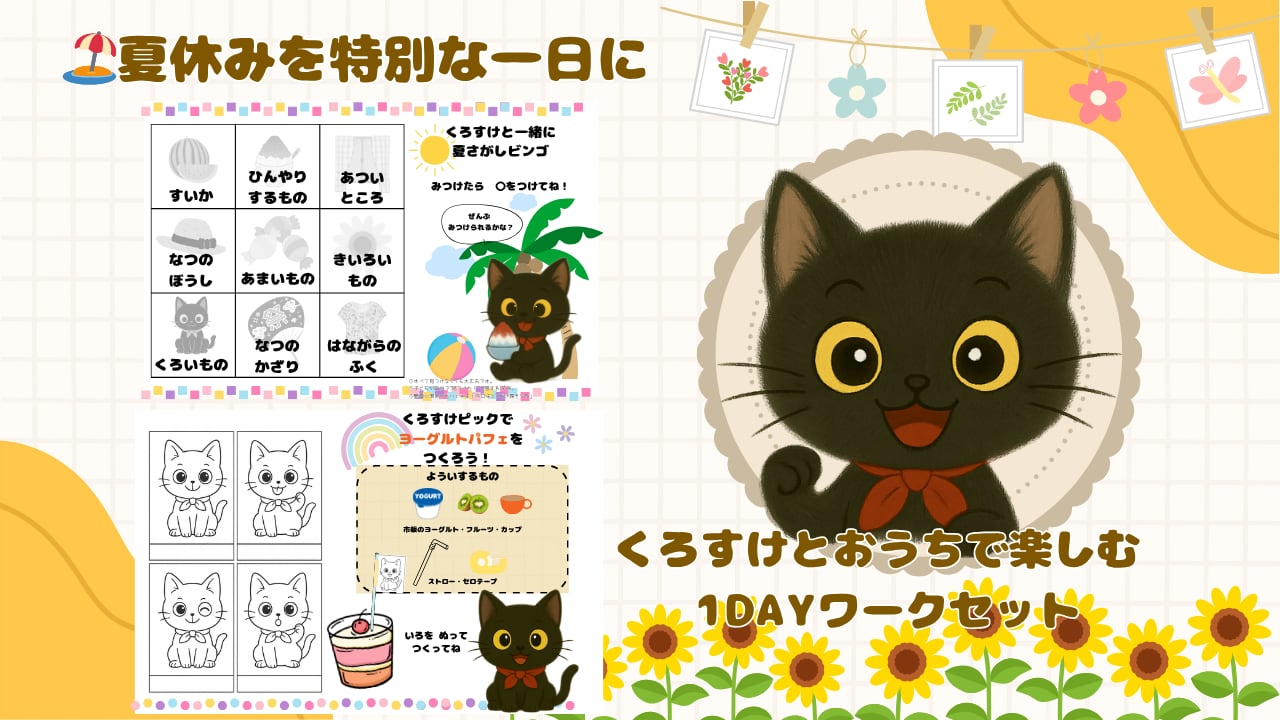 夏の森をたんけん!読む×やってみるがひとつになったワーク 黒ねこの「くろすけ」と一緒に、夏の森で発見の旅へ。 ことば・表現・集中力を自然に育みながら、 **世界にひとつだけの“夏の思い出ブック”**が作れます。