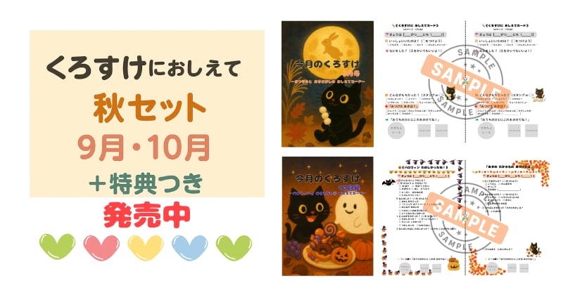 くろすけにおしえてカード【秋セット】 9月号+10月号+限定特典つき|親子で楽しむ1日1枚カードワーク/PDFダウンロード販売 価格:¥800(税込) ※単品購入より 200円お得&特典つき くろすけといっしょに、「秋」を記録しよう 「今日はどんな1日だった?」 親子のふりかえりが自然にうまれる、“1日1枚”の記録カード。 9月号・10月号をセットにした秋限定バージョンです。 おつきみ、けいろうのひ、ハロウィン、あきさがし… 秋の行事や自然の変化を、くろすけと一緒に楽しくことばに残しましょう。