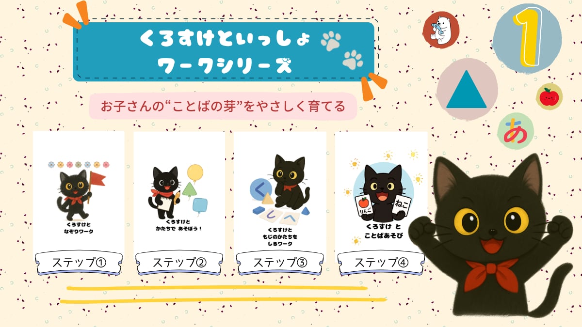 ○△□から、はじめの“おえかき”へ 形をまねて、見て、描いて楽しもう! 黒ねこの「くろすけ」と一緒に、基本の図形を見つけて・なぞって・組み合わせて、形の感覚を育てるワークです。 “描く力”のはじまりにぴったりのステップです。