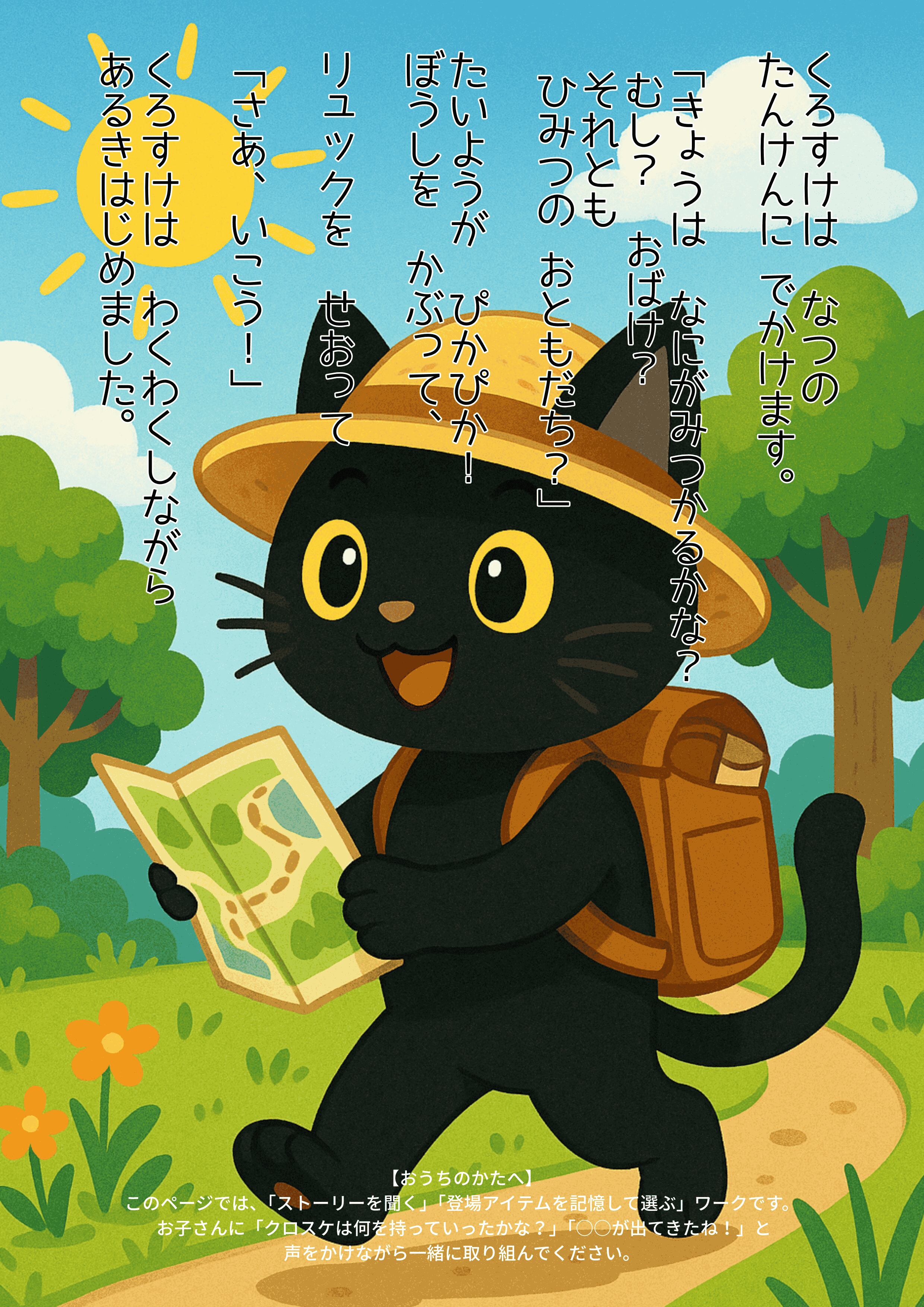 くろすけと なつの ぼうけん|3〜5歳向け・絵本風知育ワークブック(PDF全24ページ)