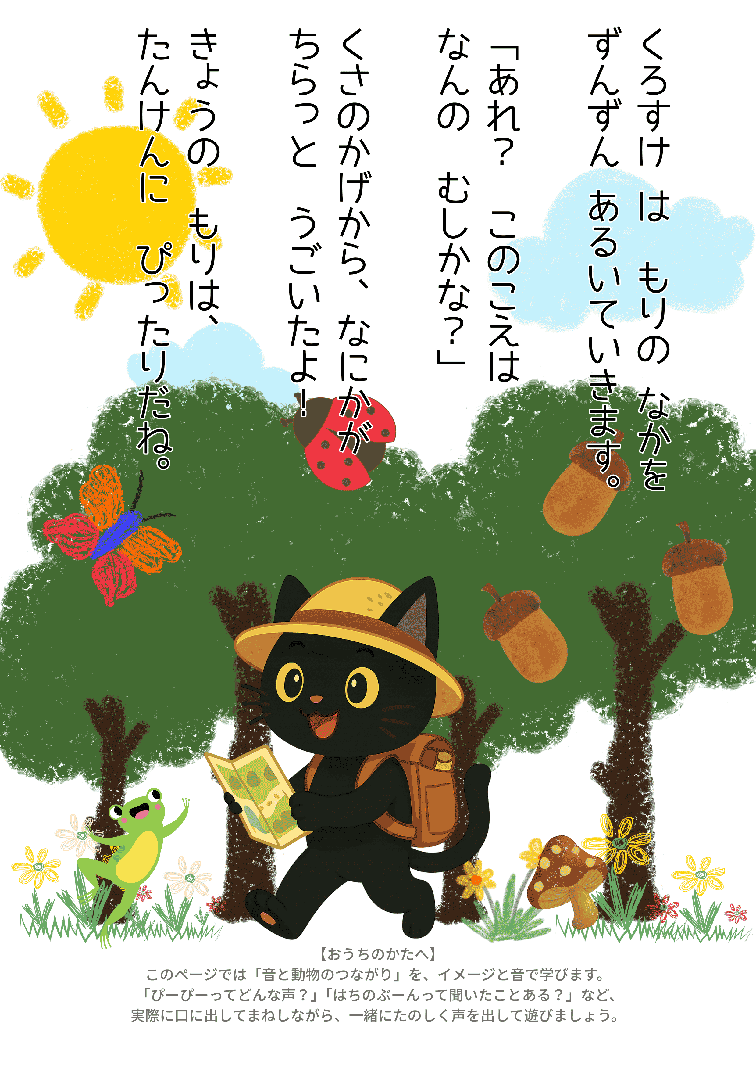 黒ねこの「くろすけ」と一緒に、夏の森で発見の旅へ。