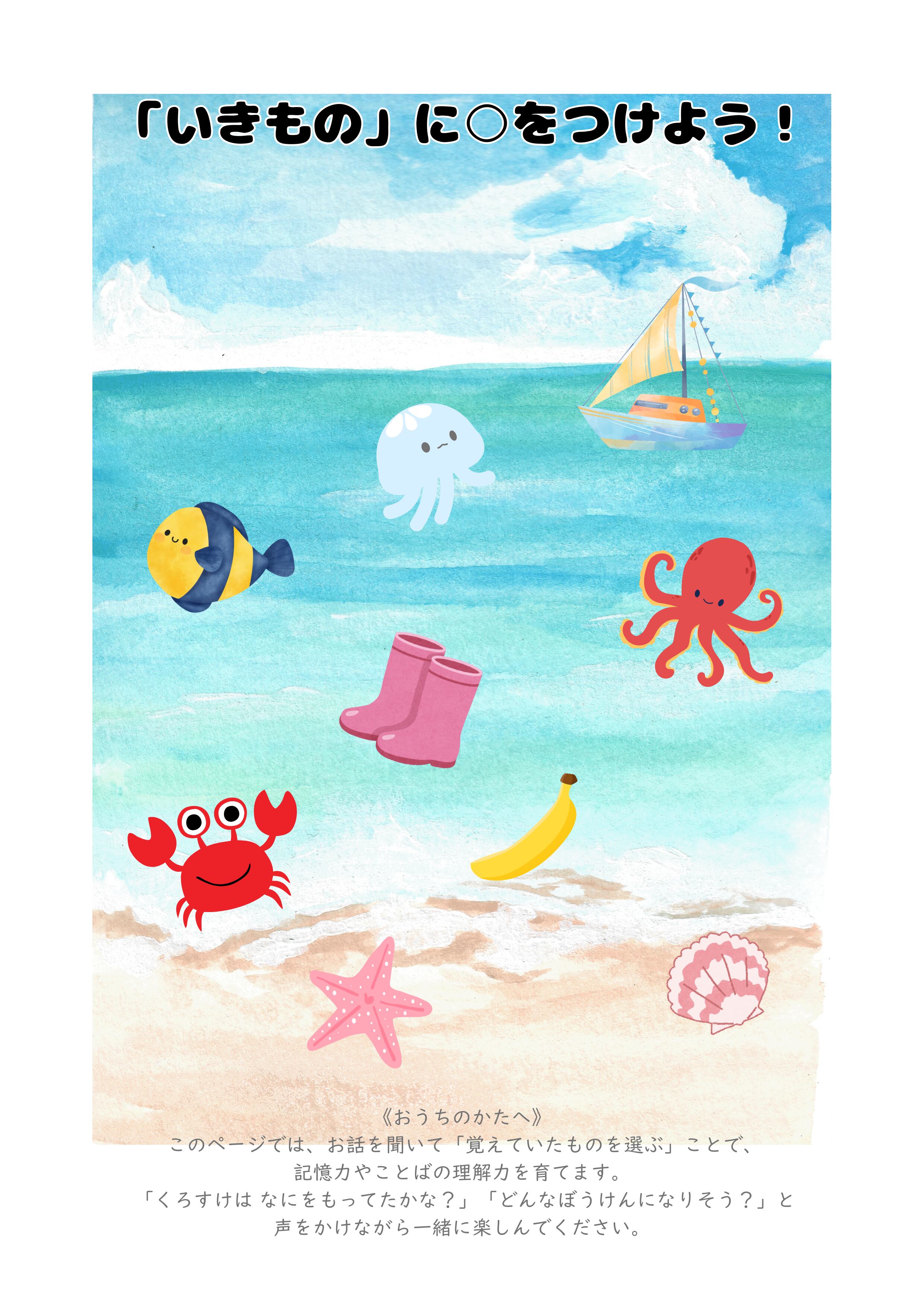 くろすけと うみの いきもの|3〜5歳向け・絵本風知育ワークブック(PDF全21ページ)