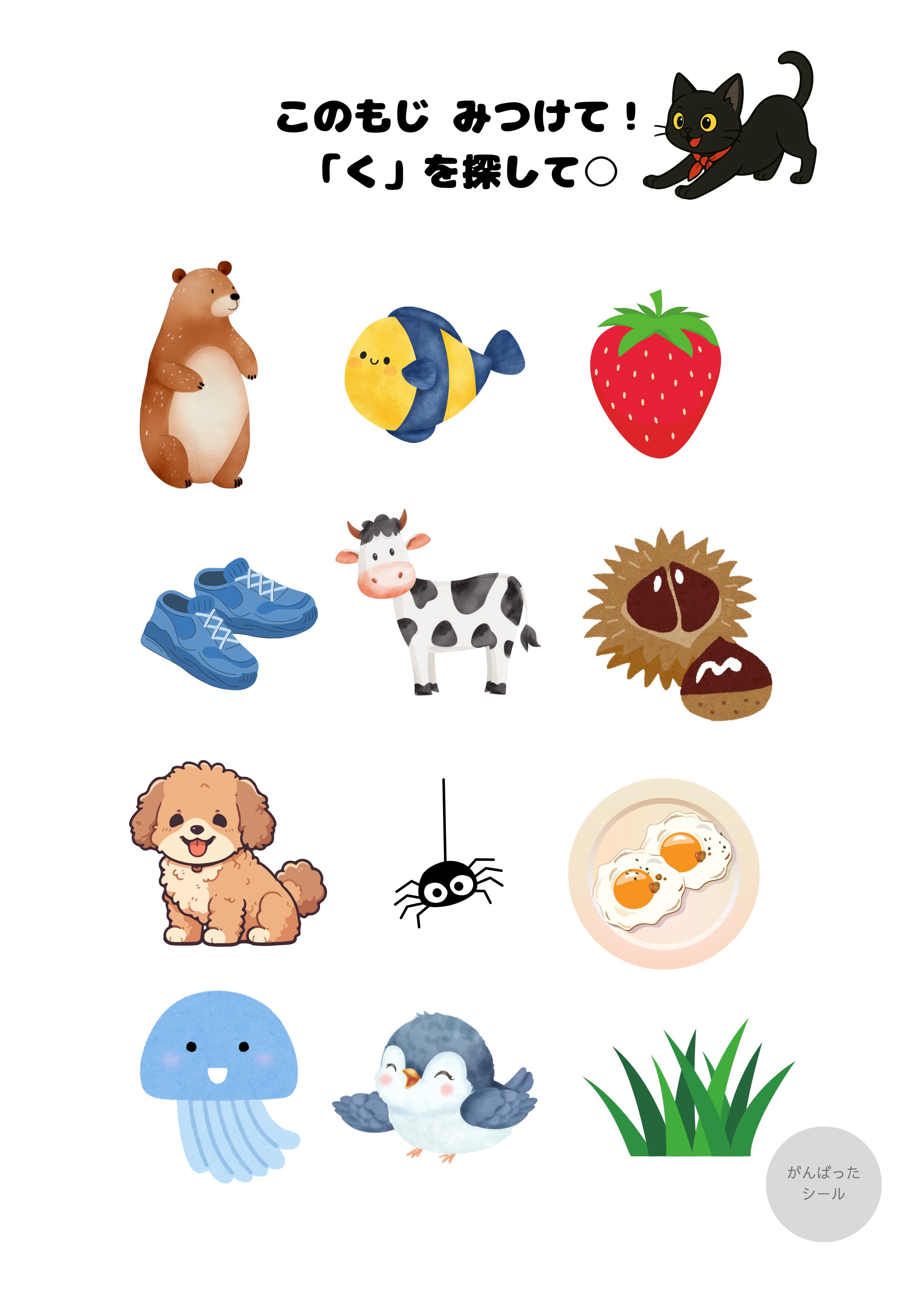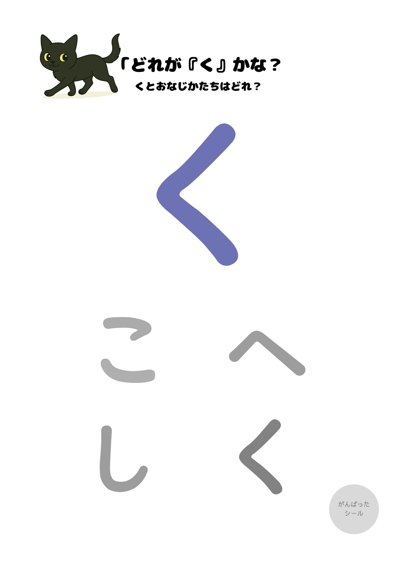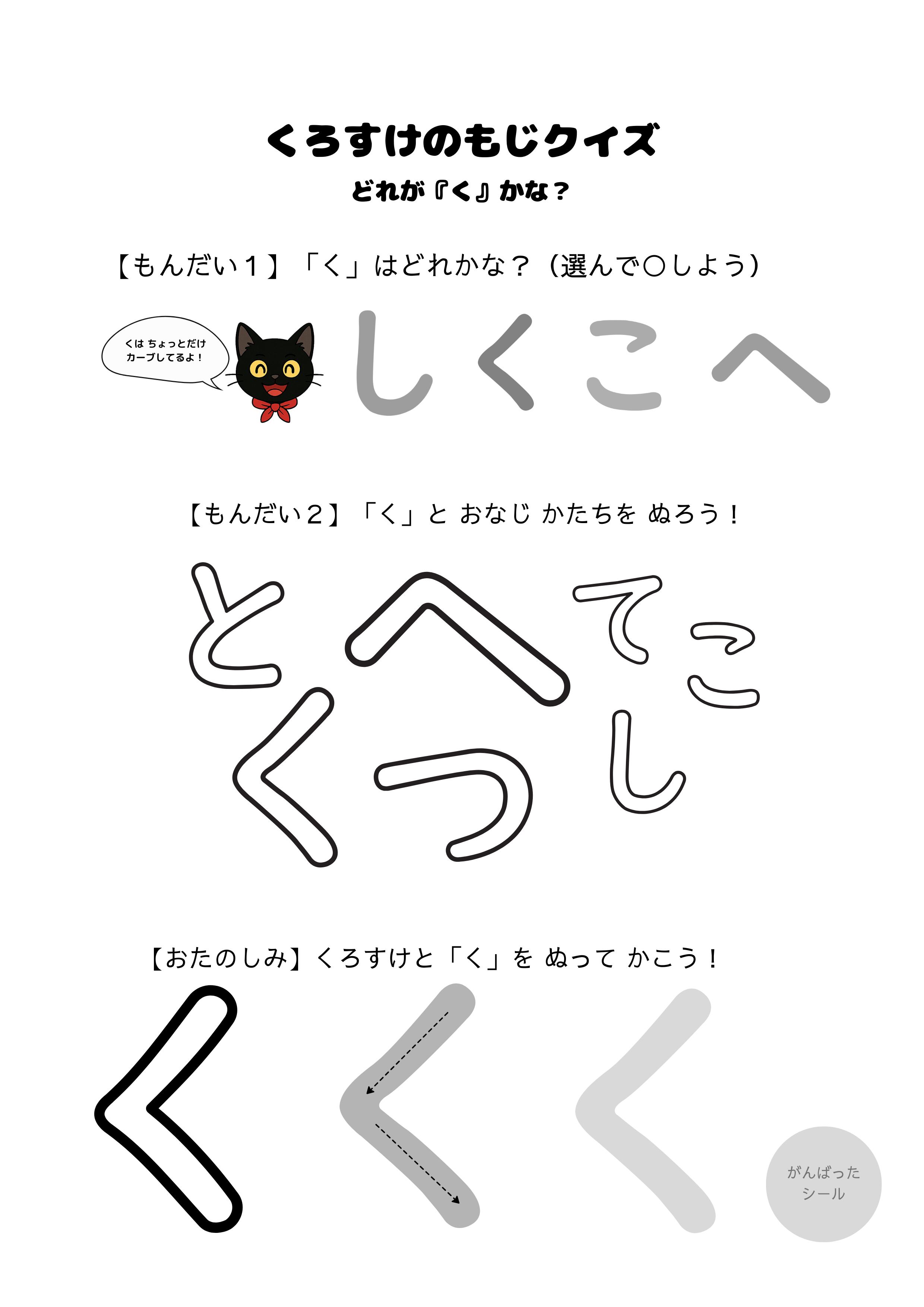 黒ねこの「くろすけ」と一緒に、ひらがなの“かたち”に気づき、親しむワークです。