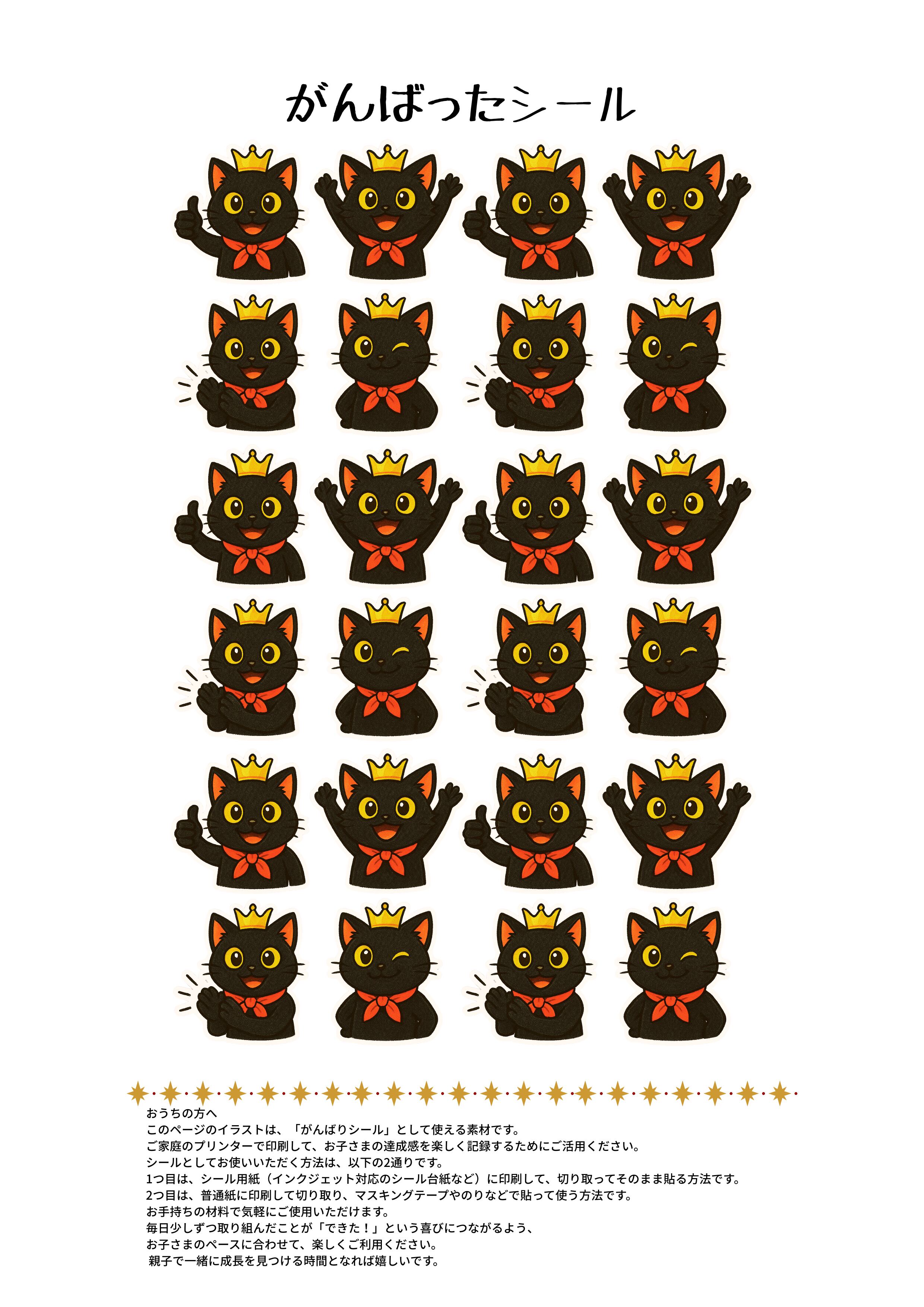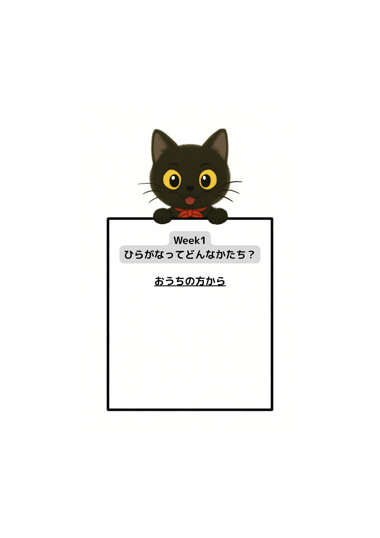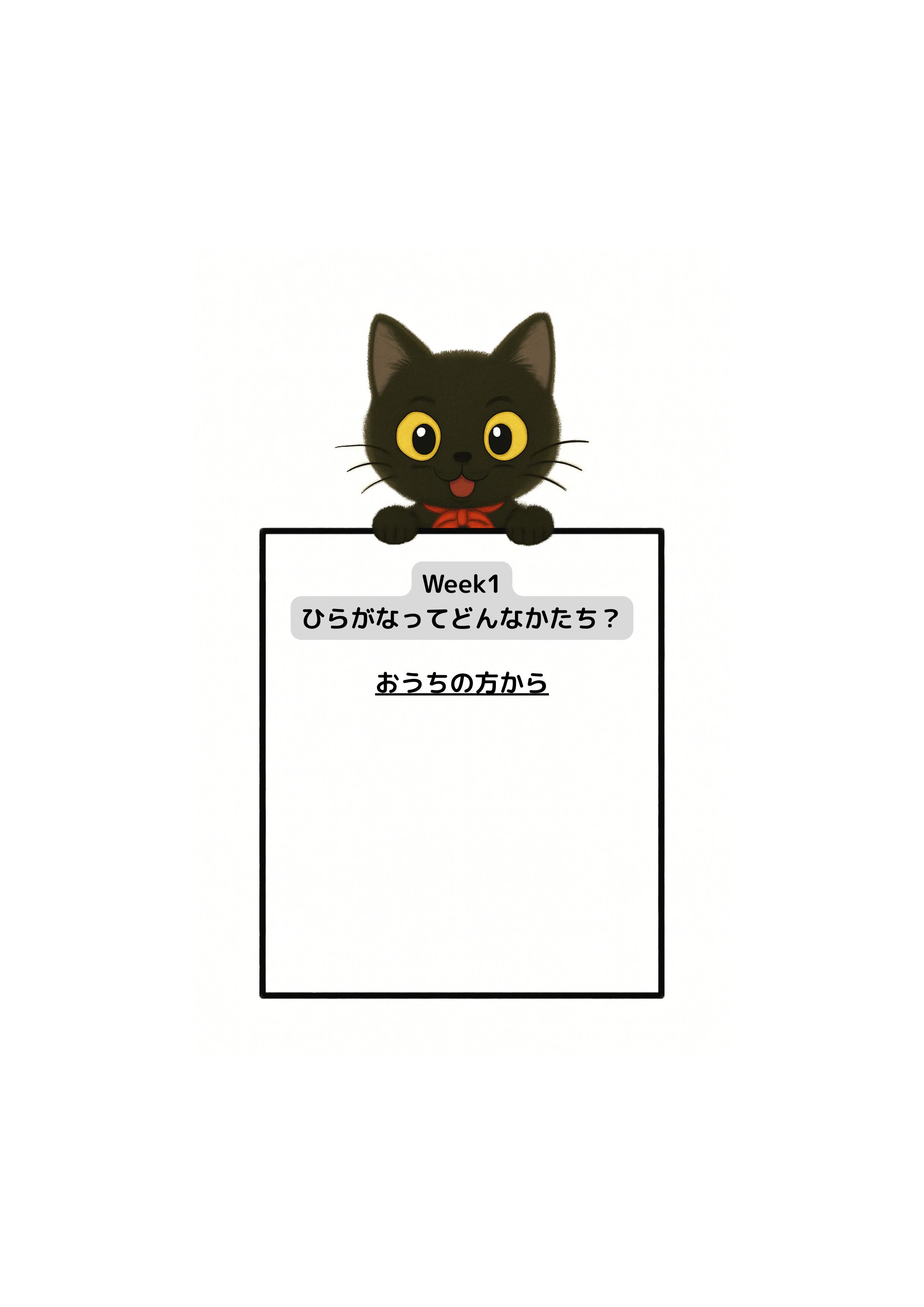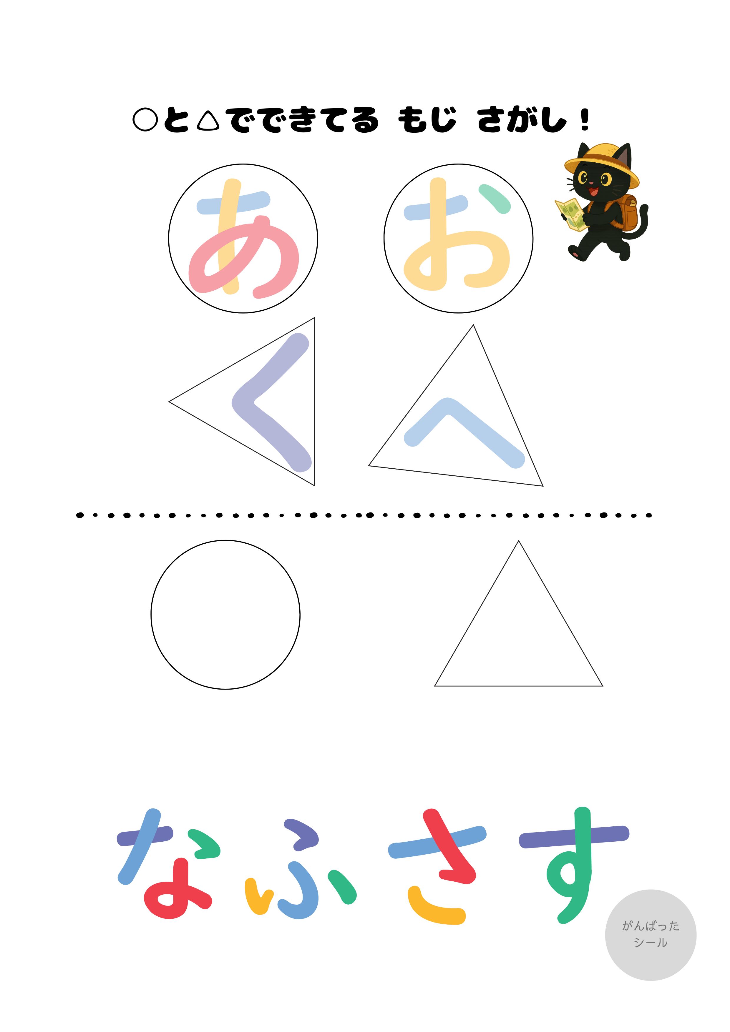 黒ねこの「くろすけ」と一緒に、ひらがなの“かたち”に気づき、親しむワークです。